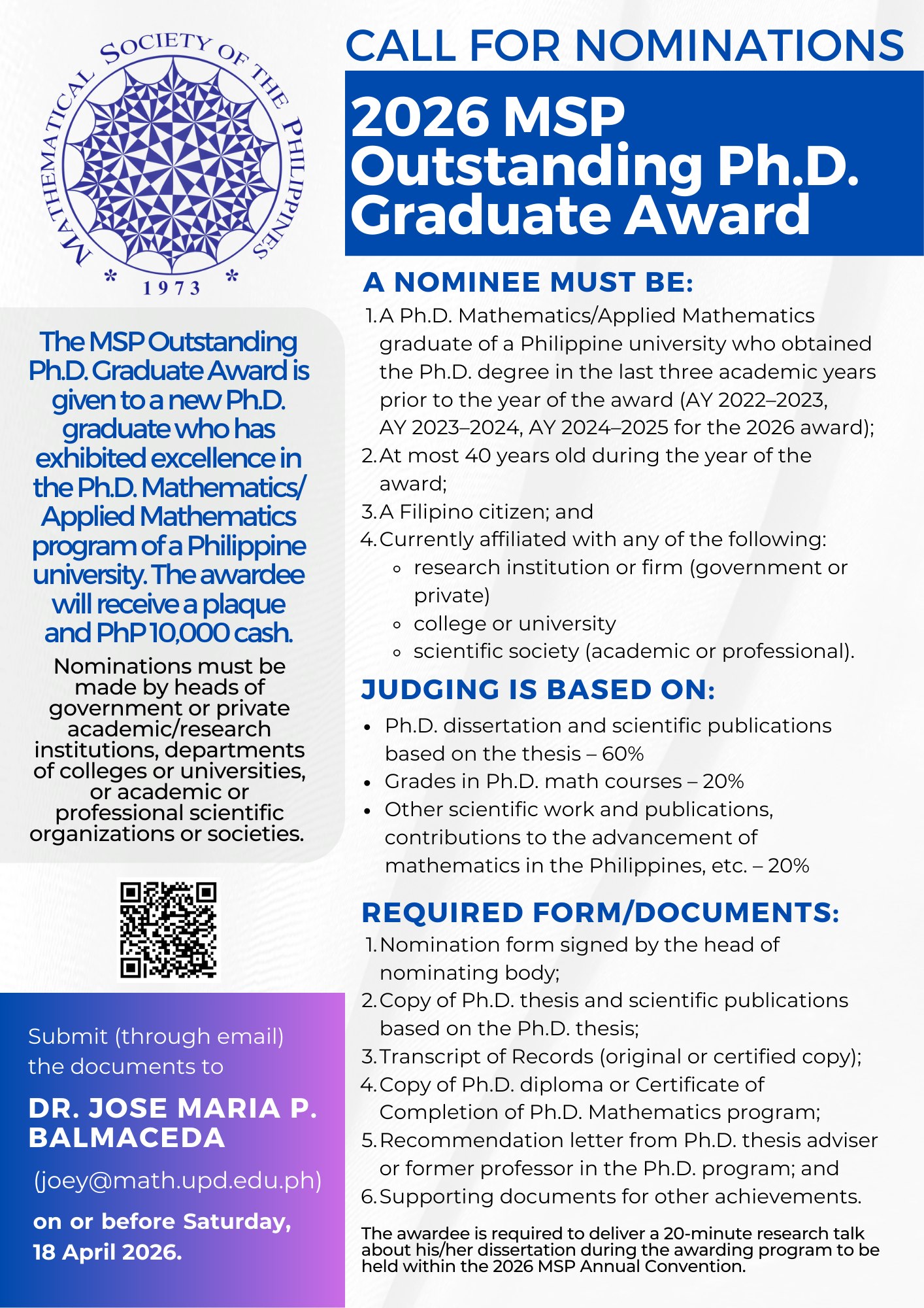 The MSP Outstanding Ph.D. Graduate Award is given to a new Ph.D. graduate who has exhibited excellence in the Ph.D. Mathematics/ Applied Mathematics program of a Philippine university.