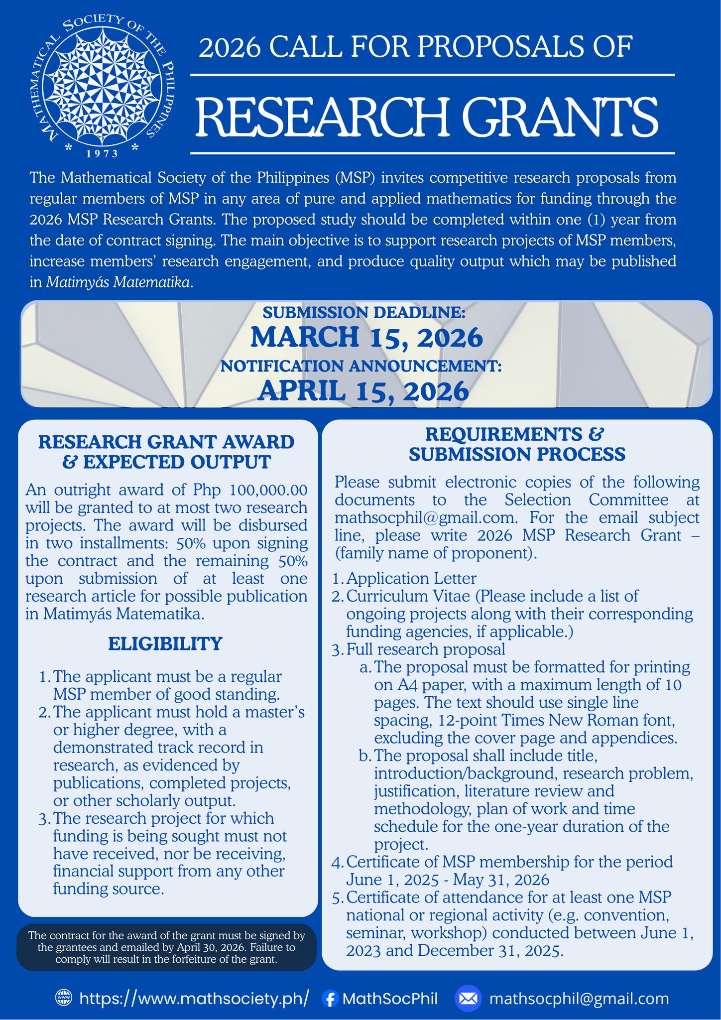 The Mathematical Society of the Philippines (MSP) invites competitive research proposals from regular members of MSP in any area of pure and applied mathematics for funding through the 2026 MSP Research Grants. The proposed study should be completed within one (1) year from the date of contract signing. The main objective is to support research projects of MSP members, increase members’ research engagement, and produce quality output which may be published in Matimyás Matematika.